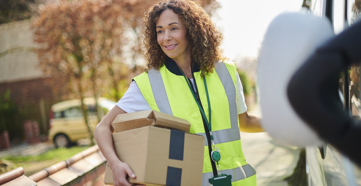 Female courier wearing a safety vest delivering parcels.